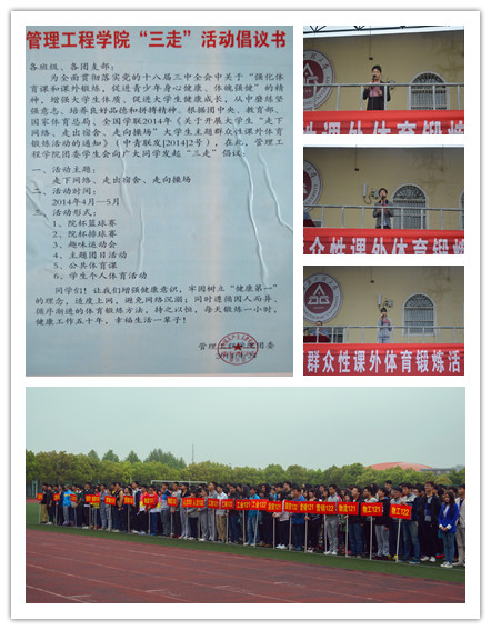 今后,管理工程学院将围绕“三走”活动主题,举办一系列课外体育锻炼活动,并通过团属微博、微信进行宣传和展示,培养同学们体育锻炼意识、养成健康的体育锻炼习惯,真正做到“走下网络、走出宿舍、走向操场”。