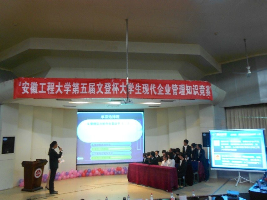 “大学生现代企业管理知识竞赛”是我校的大型品牌活动之一,比赛从4月初开始筹办,共有来自电气工程学院、生物与化学工程学院、管理工程学院、计算机与信息学院、数理学院、人文学院的近500名同学参加,历经初赛和复赛的层层筛选,最终来自管理、数理、人文三个学院的六支队伍进军决赛。决赛共分为“我是总经理”、“我是智多星”、“火眼金睛”和“狭路相逢勇者胜”四个环节。参赛选手们通过使用PPT展示,满怀激情的向大家解说自己独特的企业管理思想。在评委提问环节,各位选手对答自如,充分展示了自己扎实的管理学知识和临场应变能力。经最终评比,来自人文学院的“梦启程队”一举夺冠,“进击巨人队”、“搏击者队”获得二等奖,“数理逻辑队”、“快乐队”和“冰山队”获得三等奖。
