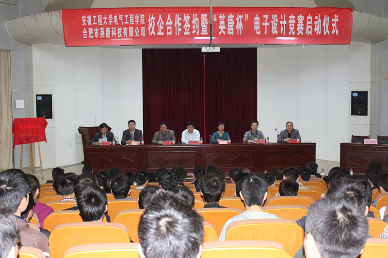 电气工程学院一直高度重视校企合作工作。经过前期积极周密的准备,电气工程学院与合肥市英唐科技有限公司校企合作签约暨“英唐杯”电子设计竞赛启动仪式于5月10日在学术报告厅隆重举行。校党委常委、教务处处长陶庭先,校党委委员、宣传部部长、电气工程学院党委书记孙浩然,校纪委委员、团委书记刘一,合肥市英唐科技有限公司总经理徐志英、合泰半导体(中国)公司处长林汉聪、新硕电子科技(杭州)有限公司总经理张志明,电气工程学院党委副书记胡长新,副院长杨会成、许钢等出席了仪式。学院各系部主任、专业教师和部分学生参加仪式,仪式由杨会成主持。