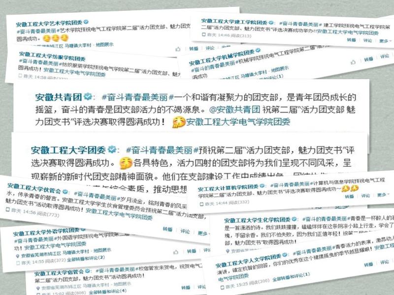 比赛过程中通过“微博上墙”进行微博互动,激发了同学们的参与热情,同学们纷纷通过微博留言为参赛团支部加油,各兄弟学院团委纷纷发来微博,预祝本次比赛成功举行!团省委也通过官方微博发来的贺电,点燃了全场活动热情!