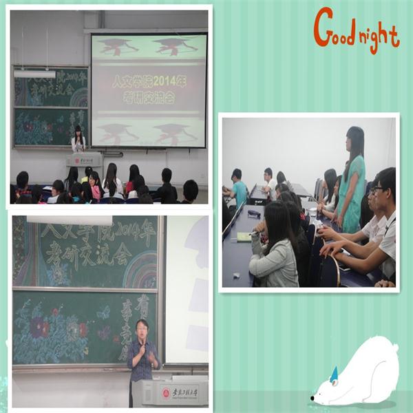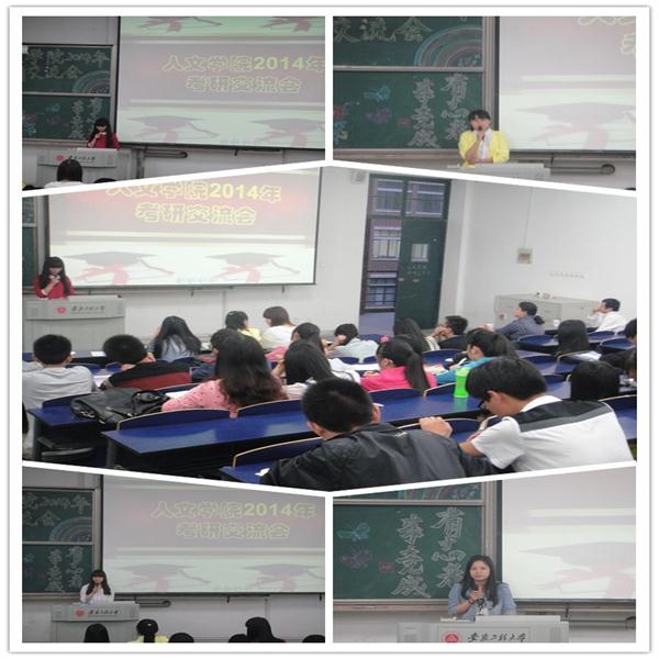 为加强学生对考研知识和经验的了解,明确考研目标,掌握相关考研技巧,5月17日晚,由人文学院团委举办的2014年考研交流会在6教215举行。