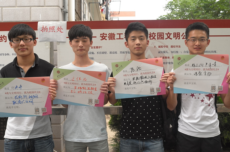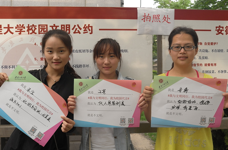 “上课玩手机就是不文明”、“公开秀恩爱就是不文明”、“自行车乱停乱放就是不文明”、“穿拖鞋进教室就是不文明”、“穿太短的裙子就是不文明”、“大量使用一次性筷子和塑料盒就是不文明”、“穿睡衣乱逛就是不文明”、“出口成脏就是不文明”、“公共场合抽烟就是不文明”、“在图书馆大声喧哗就是不文明”、“代人早签到就是不文明”、“拎别人的水瓶就是不文明”等等,通过学生自己的话语体系描述出来的种种不文明现象,通过线下和线上活动被曝光和批驳。