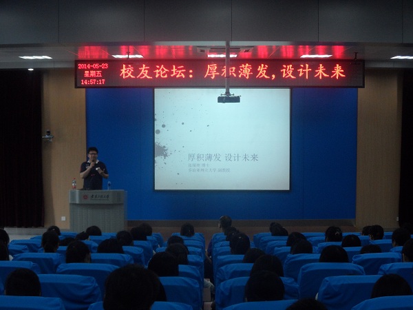 张琛奕首先介绍了自己的大学生活以及在美国的求学经历,励志的回忆、生动的叙述深深吸引了大家。接着,他从发展心理学专业角度入手,将大学四年划分为新奇、困惑、迷茫、寻找和奋斗四个阶段,每一个阶段均呈现出不同的特点。张琛奕幽默风趣的语言,深入浅出的分析,引发同学们的广泛共鸣和思考。他提醒大家,若想走出迷茫,继续寻找和奋斗,需要一定量的积累以及计划的制定和执行。针对目前大学生中存在浮躁的个性特点,他强调在知识积累方面不能过于功利,应确定一个长期的奋斗目标,同时还应根据实际情况进行相应的调整。为了做最好的自己,张琛奕勉励大家,一方面应提高自己各方面的能力;另一方面应准确评估自己,学会用批判的眼光去看待这个世界。