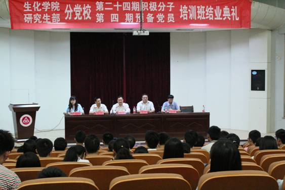 6月4日晚,生化学院、研究生部分党校第四期党员培训会暨第二十四期入党积极分子培训班结业典礼在学术报告厅隆重举行。校党委宣传部部长、校党校副校长孙浩然,办公室主任、生化学院党委书记王弘,研究生部党总支书记朱文藻,生化学院党委副书记章兵,各学生党支部书记出席了结业典礼,结业典礼由党校班主任苏燕南主持。