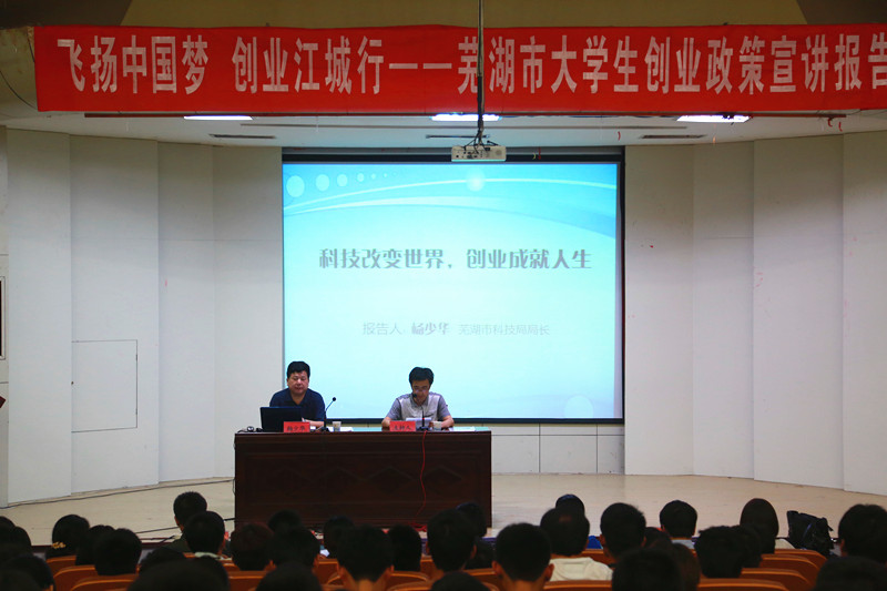 芜湖市科技局局长杨少华做了《科技改变世界,创业成就人生》的报告。他围绕这是一个创新的时代、不一样的创业时代、创业的那些事儿、成功青睐有准备的人、做时代的弄潮儿等五个方面,详细解析了国家和省市有关促进高校大学生就业创业的各项政策。他通过对商界经典案例以及我校杰出创业代表实例的分析,鼓励高校大学生善于发现机遇、把握机遇,在就业创业过程中脚踏实地、志存高远,为实现人生理想而努力拼搏。最后杨少华局长回答了部分同学的提问。