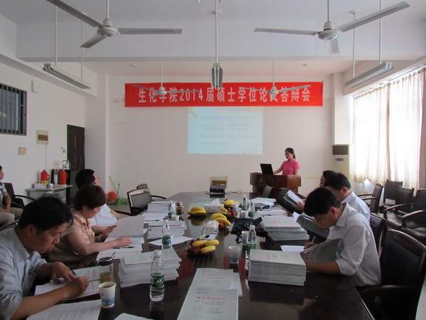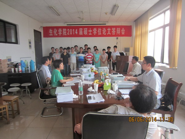 根据学校研究生部《关于做好2014届硕士研究生论文答辩及学位申请工作的通知》的精神,生物与化学工程学院于6月6日分两组在图书馆北楼408室和行政楼4004室圆满完成了应用化学、微生物学、发酵工程和环境工程专业的2014届硕士研究生学位论文答辩工作。
