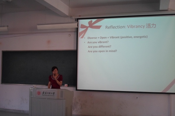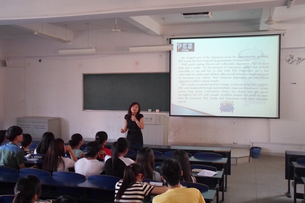 项菁则是以问题“你对美国的第一印象是什么?”导入报告内容,引发在场同学的热烈讨论。她结合所讲授的商务英语课程,以两家不同公司的产品为分析蓝本,深入探讨了美国商业如何与高校有效结合并实现双赢,使同学们接触到高等教育影响下美国浓厚的商业文化氛围,极大拓展了同学们的视野。