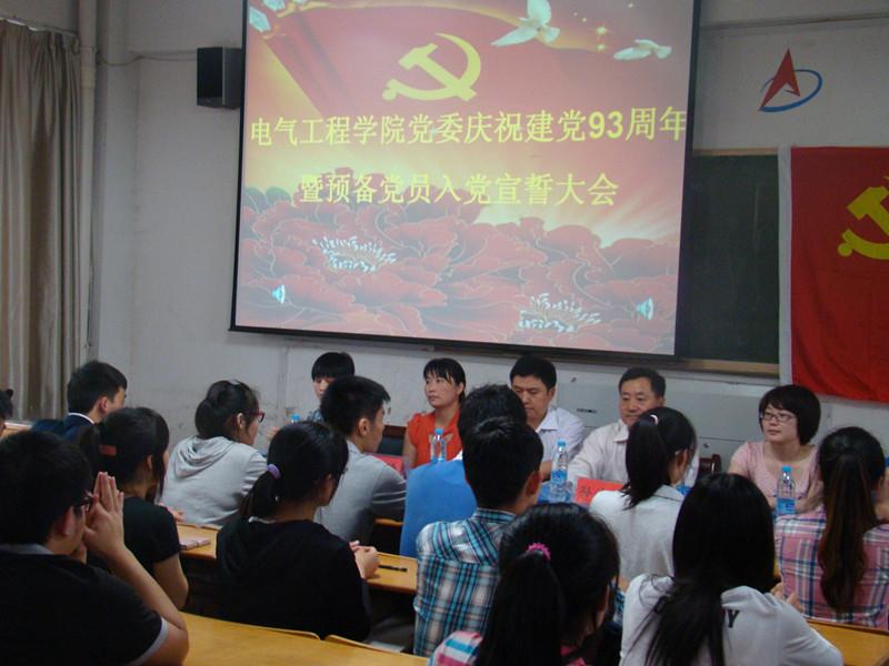 2014年6月27日,电气工程学院党委在4教111教室举行庆祝建党93周年暨预备党员入党宣誓大会,学院党委书记孙浩然、副书记胡长新以及各学生党支部书记和全院112名学生党员参加了宣誓大会。大会由自动化专业学生党支部书记蔡金平主持。
