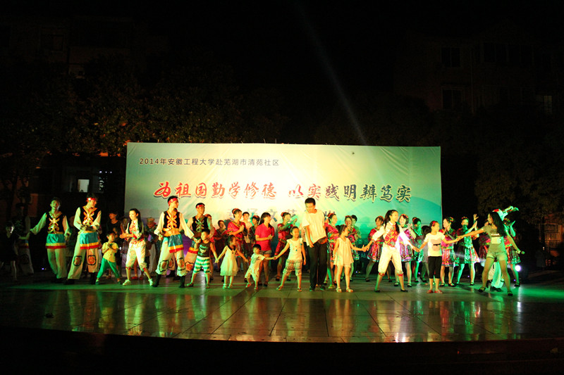 夜幕降临,华灯初上,来自校艺术团的同学们为社区居民献上了一场视听盛宴。一段热情奔放的现代舞《歌舞青春》拉开了文艺汇演的序幕。无论是气势磅礴的器乐合奏,还是婉转优美的民族舞蹈,抑或是洋溢青春活力的金曲串烧,都赢得了在场观众的阵阵掌声和喝彩。其中由清苑社区居民编剧,我校艺术团学生表演的原创小品《有爱一家人》,将活动推向了高潮,深受居民好评,许多居民纷纷拿出手机拍照纪念。“在家门口看晚会的感觉很给力,很赞!”演出结束后,一位年轻的小伙兴奋地说。