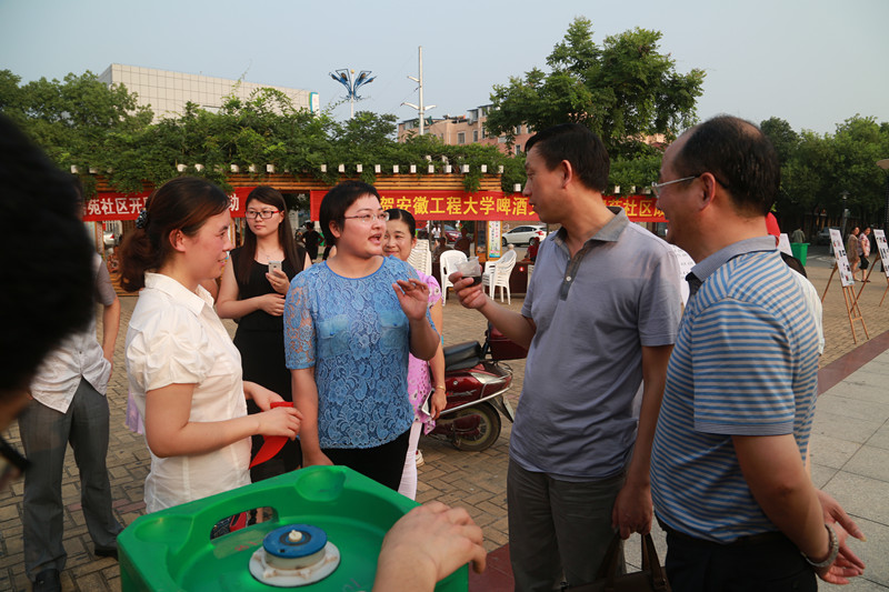 下午四时许,清苑社区的居民伴着“清苑社区的居民朋友们,你们好,我们是RayBetApp官网下载 生化学院的大学生志愿者,今天我们为大家带来了精心酿制的啤酒,欢迎大家前来品尝”的宣传,带着些许好奇和期待,陆陆续续地走到社区广场。志愿者们通过对酒的酿造工艺、品鉴文化的展示以及现场啤酒赠饮等方式,让社区百姓了解了更多关于酒的科技与文化常识。居民们好奇地接过志愿者手中的啤酒,品过一口之后便是一饮而尽。“这啤酒很爽口,喝起来很舒服”,一位老大爷喝完之后又让志愿者接了一杯。