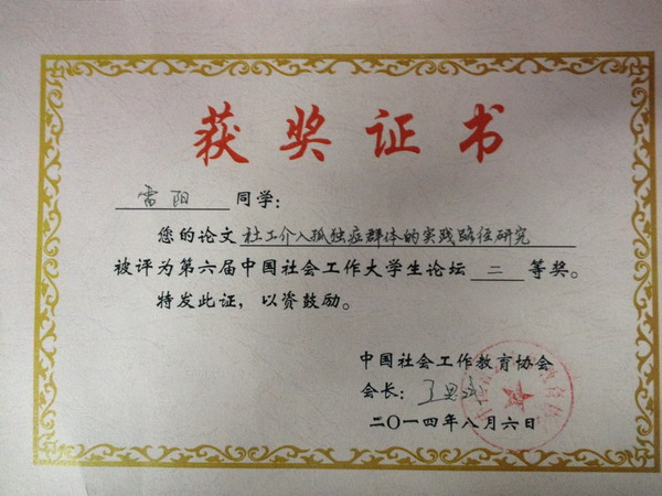 本届论坛以“社会治理创新与中国社会工作的发展”为主题,共设“社会治理创新与社会工作制度建设”、“政府购买服务中的社会工作实践”等十个分论坛。大会共收到全国百余所高校社会工作专业研究生与本科生提交的论文近220篇。经过会前初选、大会发言、答辩交流和专家点评等环节,我校社会工作专业2011级学生雷阳的论文《社工介入孤独症群体的实践路径研究》获得二等奖。