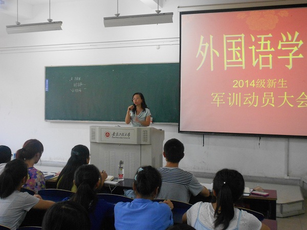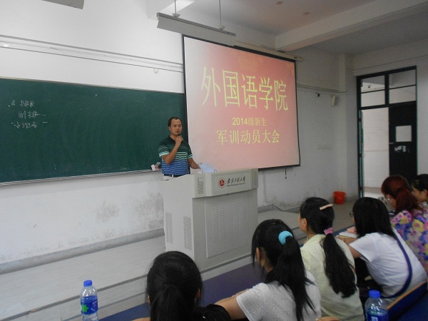 9月7日下午3点,外国语学院在6J111举行2014级新生军训动员大会。院党委副书记谈丽华出席大会并做了军训动员。大会由2014级新生辅导员李飞主持。