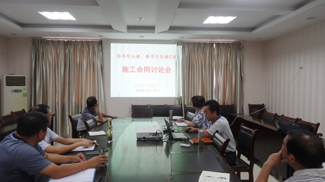 9月10日上午,总务处(基建办)召开图书综合楼和教学实验楼C座施工合同讨论会,就初步起草的施工合同进行研讨。总务处处长张国友,副处长盛彬、胡章文和相关科室工作人员参加了会议。