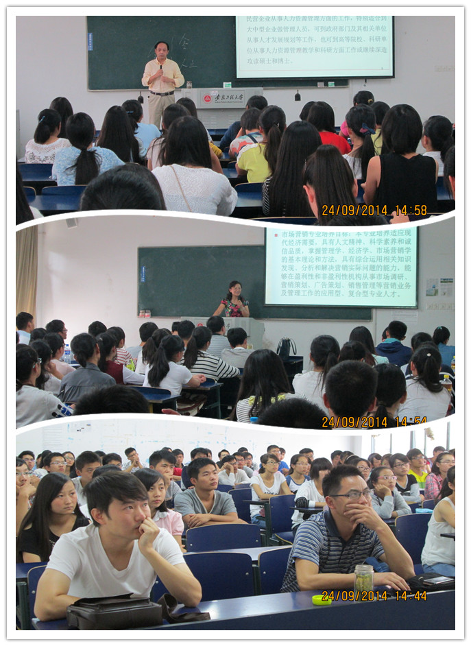 9月24日下午,管理工程学院在5号教学楼举办了2014级新生专业介绍会。学院党政领导,全院教师以及2014级工商管理、市场营销、工业工程、物流管理、国际经济与贸易、人力资源管理和工业工程专升本等七个专业共计557名新生到场参加。