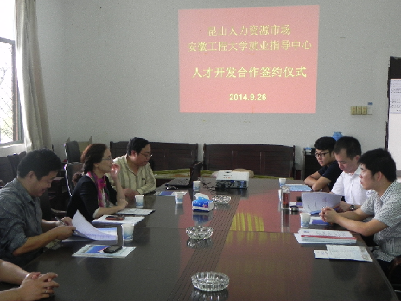 活动当天,苏国红会见了昆山人力资源市场集团公司运营总监华成一行。苏国红首先感谢昆山人力资源市场长期以来对学校就业工作的支持,并希望通过此次人才对接,探索新的合作模式,为地方和企业提供强有力的人才智力保证。华成对我校的办学实力、办学定位以及毕业生培养质量表示赞赏和肯定,并希望进一步加强与我校的紧密合作。随后,学生处处长张开炳代表学校与昆山人力资源市场签订“人才开发合作协议书”。