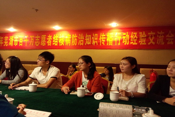 为响应芜湖市百千万志愿者结核病防治知识传播行动,10月12日上午,外国语学院大学生菁菁志愿团骨干和皖南医学院、安徽师范大学的大学生志愿者一同参加了由芜湖市疾病预防控制中心组织的2014年芜湖市百千万志愿者结核病防治知识传播行动经验交流会。