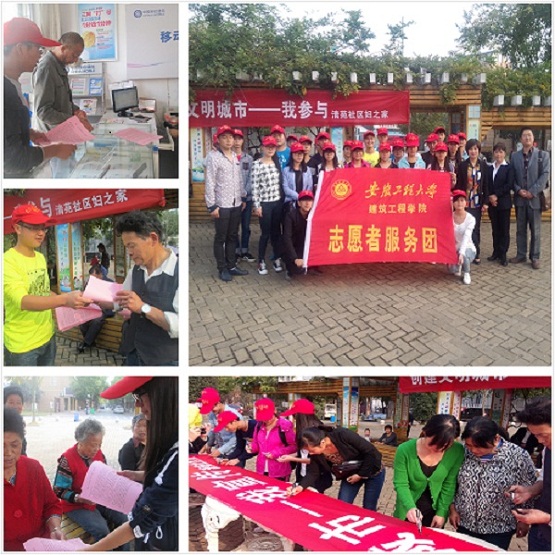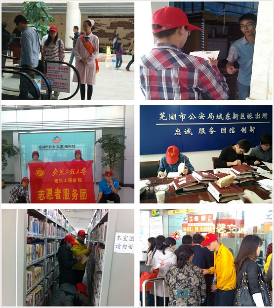 建筑工程学院大学生志愿服务团成立以来,在校内外开展了形式多样的志愿服务活动,不断加强大学生志愿服务的基地化、项目化和制度化建设。如长期在校内开展“风信子”阳光送信服务、自行车整理、图书馆图书整理活动,定期到官陡街道鸠兹社区、清水街道清苑社区、芜湖市第二人民医院、美的希望小学、清水小学、孤儿院、敬老院、派出所、汽车站、公交车站、赭山公园、雕塑公园等开展志愿服务活动,每年参与志愿活动达700人次,取得了良好的社会效应。