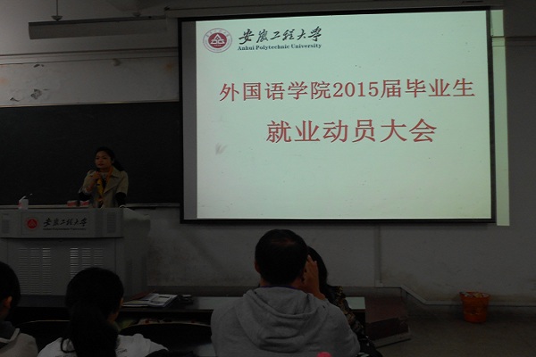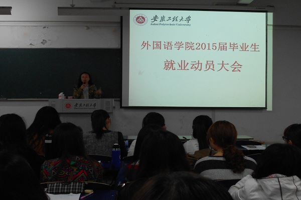 为激发毕业生求职积极性,帮助毕业生树立正确的择业观,指导我院毕业生顺利就业,10月29日下午,外国语学院在6教113召开2015届毕业生就业动员大会。院党委副书记谈丽华、2015届毕业班辅导员及全体毕业生参加了此次动员大会。会议由辅导员王钰老师主持。