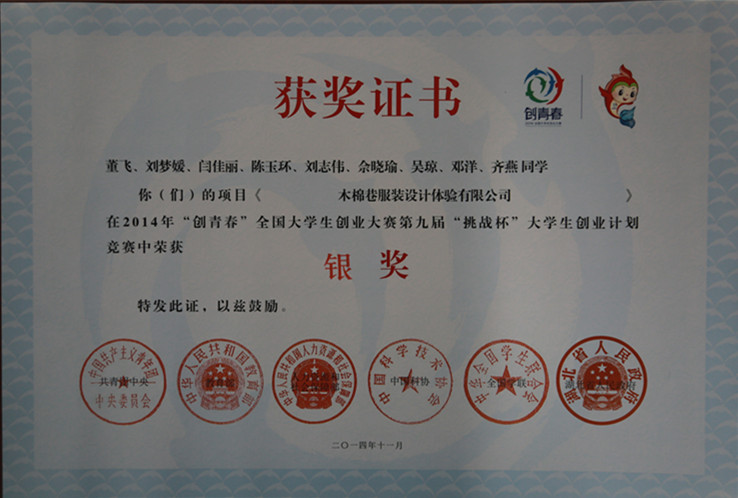 11月4日,“创青春”全国大学生创业大赛终审决赛在华中科技大学落下帷幕,包括香港、澳门在内的全国209所高校的385件作品角逐出金、银奖。由我校邬红芳等教师指导的、董飞等九位同学参与完成的“木棉巷服装设计体验有限公司”获得第九届“挑战杯”全国大学生创业计划大赛银奖。