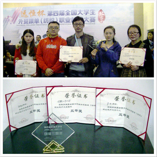 第四届全国大学生外贸跟单(纺织)职业能力大赛于11月1日在北京服装学院拉开帷幕。本项赛事是由教育部高等学校纺织类专业教学指导委员会与中国纺织服装教育学会联合主办,本届比赛吸引了来自东华大学、天津工业大学、苏州大学、浙江理工大学、北京服装学院等全国32所知名高等院校39支参赛队伍前来参赛。在比赛中,纺服学院三名同学凭借扎实的基本功沉着应对,最终,段彩玲和吴倩从一百多名选手中脱颖而出荣获个人三等奖。同时,代表队为学校斩获团体三等奖,受到了大赛组委会和其他兄弟院校的高度赞扬,进一步提高了我校在全国纺织服装专业领域的知名度。
