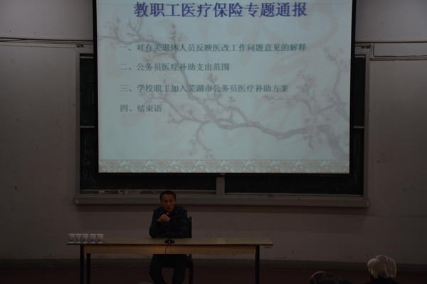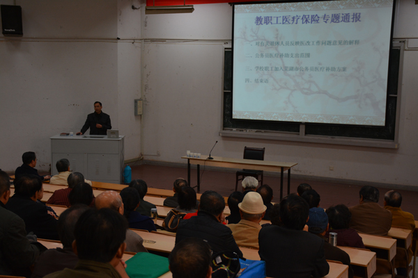 11月18日下午,学校在2教报告厅召开教职工医疗保险及住房建设情况通报及征求意见会。副校长郭兴众出席,工会、总务处、人事处、财务处负责人,离退休教职工和部分在职教职工参加了会议。会议由校工会主席、离退休处处长王河主持。