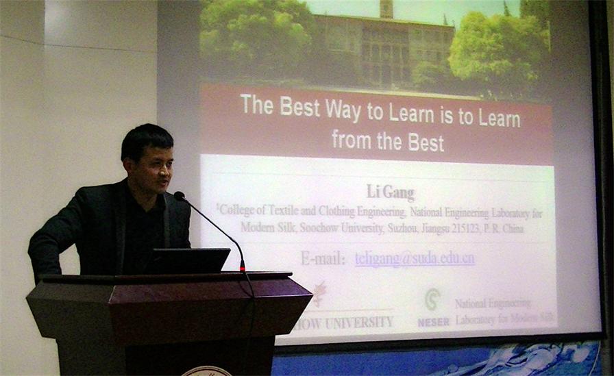 在报告会中,李刚博士以座右铭“The Best Way to Learn is to Learn from the Best”为引,结合在母校的学习经历,简要介绍了自己的纺织研学之路,并分享了学习经验。随后,他结合自己科研实践,解释了国际上关于现代纺织的新定义——软材料科学,并以生物医用纺织材料领域为例,介绍了现代纺织、生物材料和生物医学工程等多领域跨学科的前沿研究。学术报告后,李刚博士又与我校纺织相关专业教师就我校纺织服装学科未来的发展进行了热切的交流和探讨。