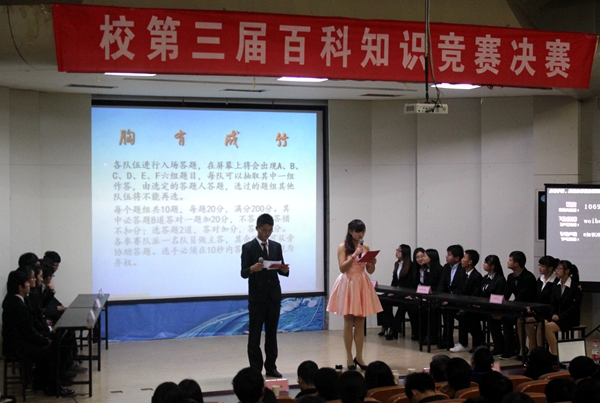启迪生活哲学,点亮人生智慧。2014年11月22日下午,在校关工委、校团委和校图书馆的指导下,由校学生读者工作委员会承办的校第三届百科知识竞赛决赛在学术报告厅举行。校关工委主任肖学东、校宣传部副部长吴月红、校图书馆副馆长李琛应邀出席。