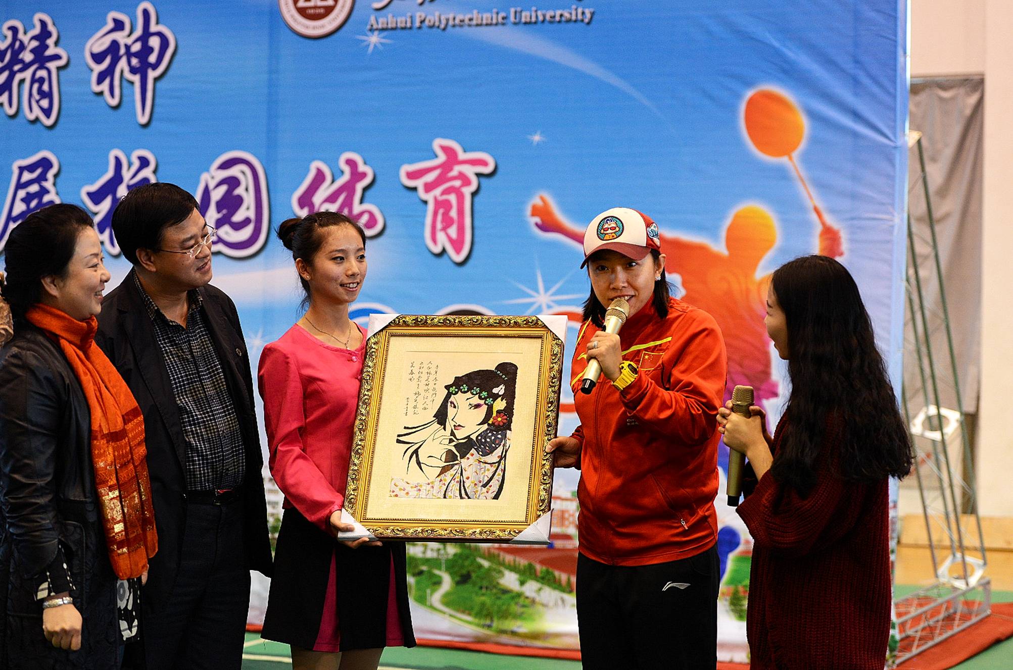 当天下午,当杜婧迈入体育馆时,全场人员的欢呼声和掌声震耳欲聋,之前酝酿已久的感情瞬间爆发了出来。观众席呈现出“欢迎杜婧”的巨大横幅,直到主持人示意全场安静,观众们才慢慢坐了下来。副校长叶常林代表全校师生对杜婧的到来表示欢迎,他向杜婧赠送了我校学生制作的刺绣《俏花旦》,杜婧表示了由衷的感谢。