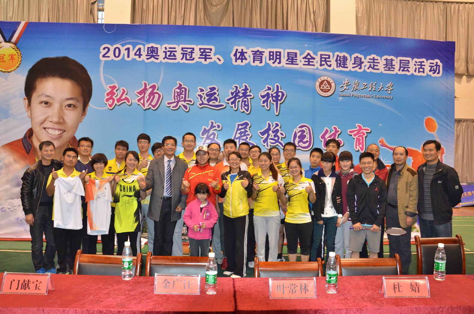 2014年中国体育文化·体育旅游博览期间,12名奥运冠军、体育明星来到芜湖开展基层行活动。我校有幸邀请到奥运冠军杜婧前来做客。学校希望借此机会,让我校师生了解冠军的成长历程,从中得到启迪,从而认知及发现自我,激励自我。