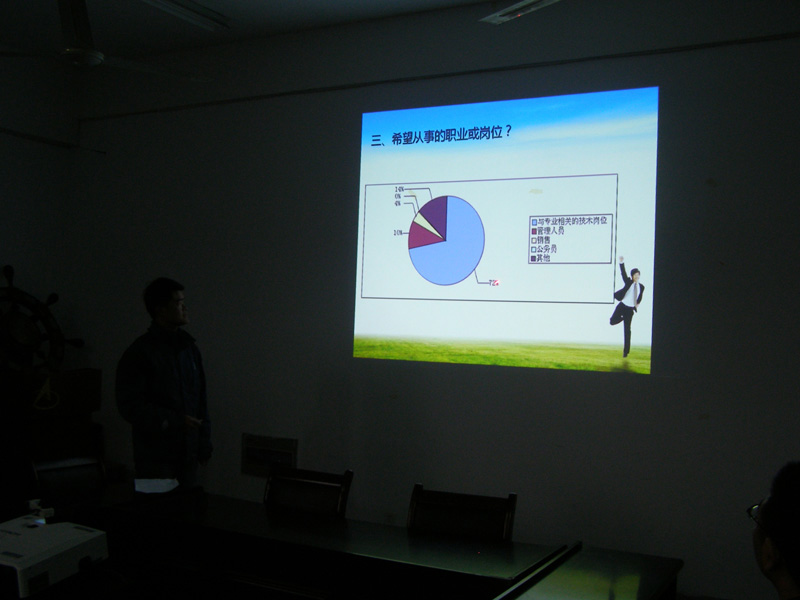 比赛分为两个部分:一是辅导员教师所带班级就业调查情况汇报,二是服务就业主题班会。在比赛活动开展之前,学院从毕业意愿、就业岗位、期望薪资等十个方面对全体毕业生进行了问卷调查,辅导员教师在调查统计的基础上充分了解所带学生的就业意向,心理状态,在比赛的过程中通过数据分析和平时工作了解,汇报目前所带班级的就业情况以及存在的困难。比赛第二部分,辅导员教师结合学生实际,设计开展主题明确,具有教育性、引导性和指导性的主题班会,帮助毕业生树立正确的职业观,确立合理的求职目标,更好的推动学生就业。比赛过程中,毕业班八位专兼职辅导员,通过ppt结合美观的统计图表、详实的数字生动的展示了比赛内容,精彩的表现赢得了阵阵掌声。
