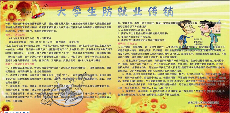 学院首先要求辅导员教师,在就业指导过程中,加强防传销教育,帮助学生树立正确的人生观、价值观、就业观,让同学们认识到传销的严重危害;提醒同学们尽量选择来学校招聘的单位求职,不要随意在网上投递简历,也防止极少数的已毕业的学生经过传销洗脑,在受害的同时欺骗学弟学妹。其次,学院团委、学生会组织在校园悬挂了“求职需谨慎,传销是陷阱”、“警惕传销陷阱,创造和谐校园”“珍爱家庭,远离传销;珍爱亲情,拒绝传销”等横幅,并制作了“大学生防就业传销”展板,详细介绍了什么是传销、如何防止传销以及误入传销自救方法等,进一步提醒同学们在求职中提高警惕,防止上当受骗。