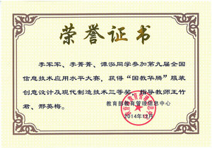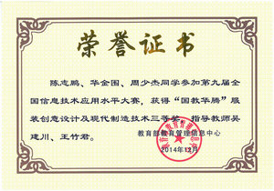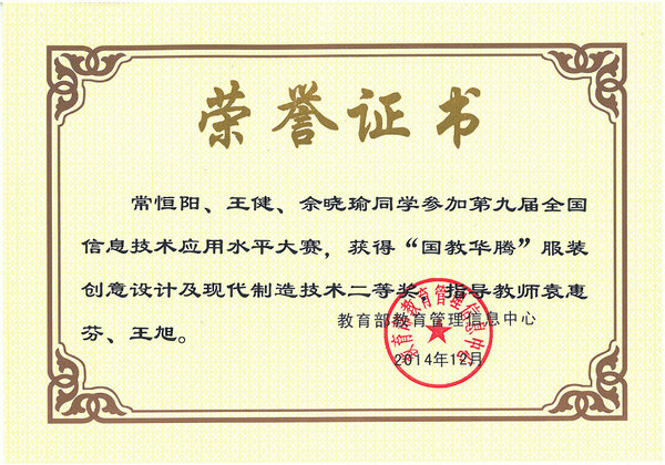 12月6日至8日,由教育部教育管理信息中心主办的第九届全国信息技术应用水平大赛总决赛在北京航空航天大学举行。由我校纺织服装学院常恒阳、王健、佘晓瑜三位同学组成的“Green Trunk”代表队取得了团体二等奖;陈志鹏、华金围和周少杰三位同学组成的“依线工作坊”代表队以及李军军、李菁菁和谭泓三位同学组成的“Rocket”代表队分别荣获了团体三等奖。