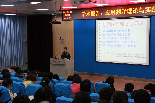 12月13日上午,上海外国语大学英语语言文学专业博士、博士生导师张健教授应外国语学院邀请在5教117作了题为“应用翻译理论与实践”的学术报告。报告会由外国语学院院长刘进教授主持。外国语学院全体教师和部分学生共150人聆听了报告,整个报告持续了两个半小时。