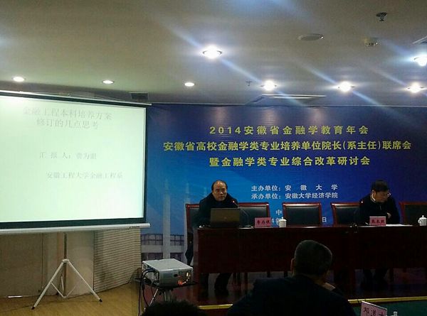 12月13日至14日,2014年安徽省金融学教育年会、安徽省高校金融学类专业培养单位院长(系主任)联席会暨金融学类专业综合改革研讨会在安徽大学召开。本次会议旨在全面推进安徽省金融学教育教学改革,促进安徽省金融学类专业的发展,不断提高安徽省金融学教育教学质量,培养复合型创新型金融人才。会议邀请了在皖教育部金融学类本科专业教学指导委员会委员、安徽省辖区内高校开设金融学类(包括金融学、保险学、投资学、金融工程、金融数学、经济与金融、信用管理)专业的学院院长、系主任、专业负责人和骨干教师共100余人参加了本次会议。我校数理学院院长费为银教授和青年教师李志民、潘海峰、梁勇等参加了会议。