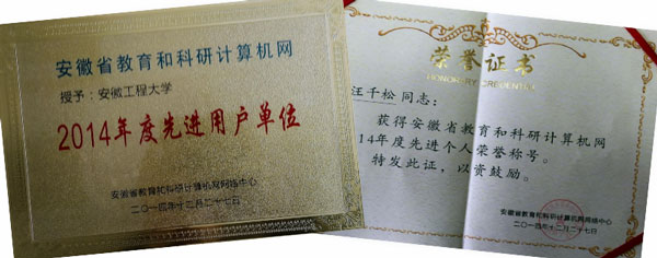 日前,在安徽省教育和科研计算机网网络中心组织开展的“教育科研网年度先进单位和个人”评选活动中,我校获得“2014年度先进用户单位”荣誉称号,现代教育技术中心汪千松同志获得“2014年度先进个人”荣誉称号。