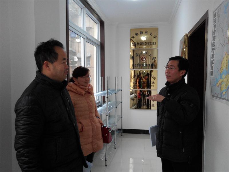 26日下午,伊长文等来到安庆市阳光社会工作服务中心。该中心是安庆市民政局批准设立的一家综合型社会工作机构,也是学院社会工作专业实习基地。伊长文首先说明了此次调研的目的,并介绍了我校社会工作专业的课程设置、人才培养等情况。中心总干事苏胜利代表中心对教师们的到来表示热烈欢迎,并介绍了安庆市目前整体社工机构现状、阳光社会工作服务中心所承担的服务项目以及机构未来的发展规划等,并提出希望得到社会工作专业教师的指导以及社会工作专业毕业生的加盟。章靖平分析了当前社会工作专业的就业情况,并就学生实习及就业等具体工作与中心人员进行了沟通。双方还就居家养老、临终关怀、四点半课堂等服务项目的运营与管理进行了探讨。