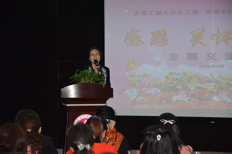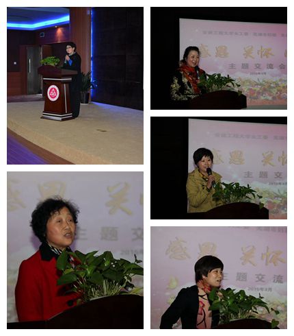 交流前,苏国红发表了热情洋溢的致辞。她首先代表学校对芜湖市妇联领导和芜湖市女知联委员的到来表示热烈欢迎。随后,苏国红简要介绍了学校的发展概况和近期主要工作。她说,今年适逢我校建校80周年,也是我校深化改革的元年。当前,学校正在落实国务院办公厅《关于进一步加强和改进新形势下高校宣传思想工作的意见》和中共中央《关于加强和改进党的群团工作的意见》,全面建设高水平大学、全面深化改革、全面推进依法治校、全面从严治党必将成为我校改革发展的新常态。本次以“感恩关怀成长”为主题的交流活动正是女工委和女知联发挥在用中国故事、中国声音传递中国精神中的独特作用,将培育和践行社会主义核心价值观落细落实的实际举措。在座的各位都是来自于芜湖各行各业的精英和成功女性,希望借此机会,让大家更多地了解我校,在今后我校的毕业生就业、学校建设等方面能够给予更大的支持。苏国红最后还饱含深情地为与会者送上了美好的祝福。