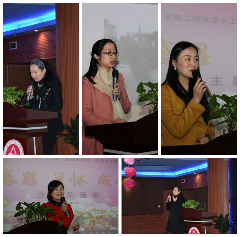 芜湖市原弋江区的政协主席朱成霞、芜湖市繁昌县纸鸢香草合作社负责人汪琼、芜湖市深蓝律师事务所高级合伙人刘朝晖、芜湖市广播电视台新闻频道副总监首席主持人徐晨星、芜湖市四院院长沈棫华,我校女工委副主任纺织服装学院邬红芳教授、生物与化学工程学院副院长薛正莲教授、电气工程学院教师吕琛、生物与化学工程学院辅导员査桂义分别结合个人成长和本职工作做了主题交流发言。她们一件件真实的成长实例,一句句质朴的感悟话语,让所有在场的人都为之动容,深受教育。现场的大学生们还与到会的各界精英进行了现场互动。