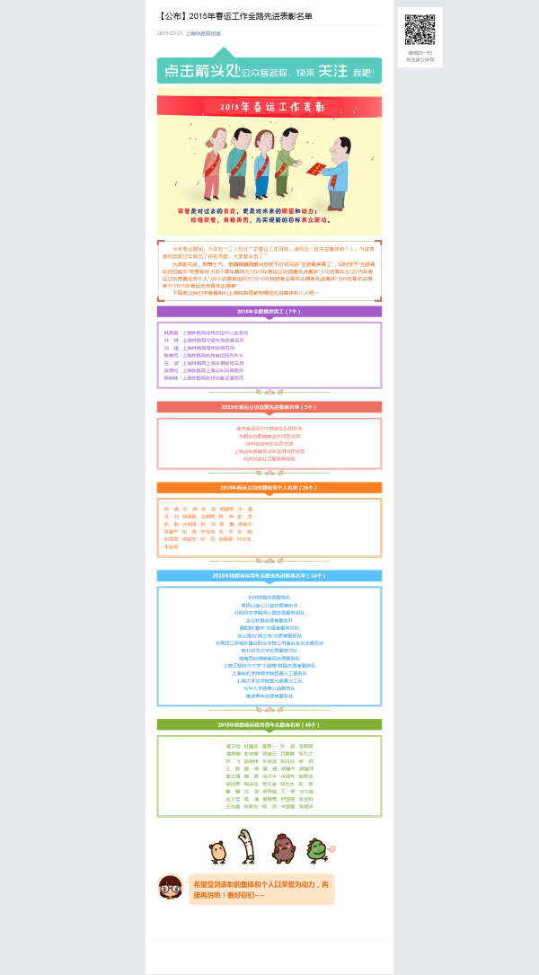 2015年春运工作全路先进表彰名单http://mp.weixin.qq.com/s?__biz=MjM5OTM2OTI3NA==&mid=204274594&idx=1&sn=ae7e15bbc239978564b732b42571bbd0#rd
