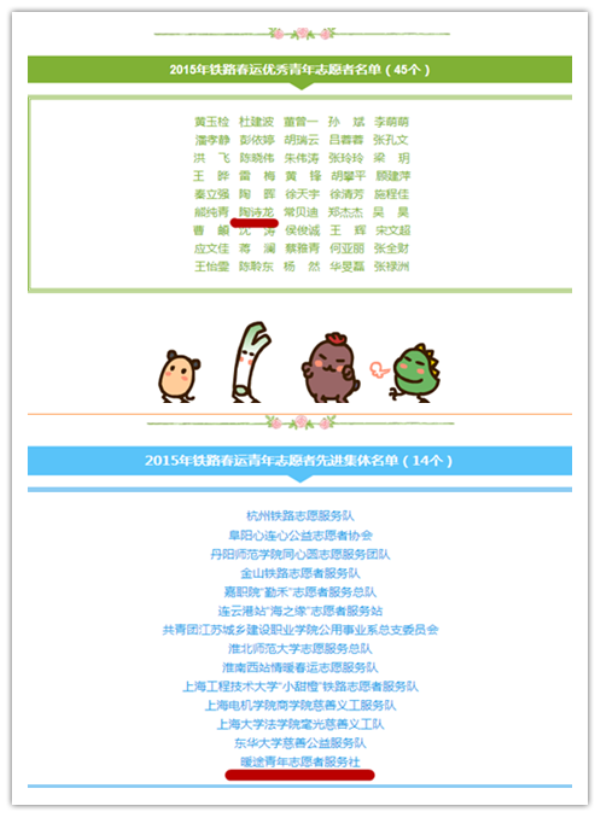 据悉,在今年全国铁道团委表彰的春运先进集体和个人中,我校“暖途”青年志愿者服务社被评为“2015年铁路春运青年志愿者先进集体”,“暖途”社长陶诗龙被评为“2015年春运优秀青年志愿者”。