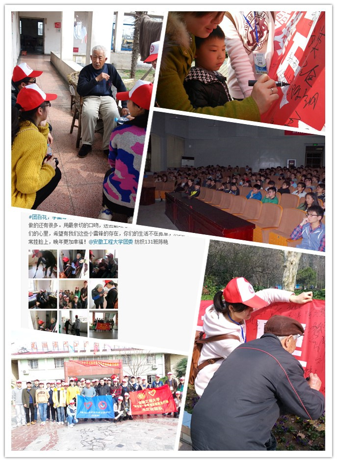 3月21日上午,条幅签名活动相继在滨江公园、赭山公园和学校三食堂门口展开。在活动现场,芜湖市民和广大同学纷纷在宣传条幅上留下签名,表达了希望投入到学习雷锋精神的热潮中,并做一些力所能及的公益活动的愿望。下午,“玉兰花”团队的一支小分队来到了芜湖市弋江区马塘养老中心。在工作人员介绍敬老院的相关情况后,小分队的成员们有序来到老人们的房间,陪老人聊聊天、梳梳头、剪剪指甲,为他们表演节目。老人们的脸上洋溢着感动的笑容,为志愿者们竖起了大拇指。