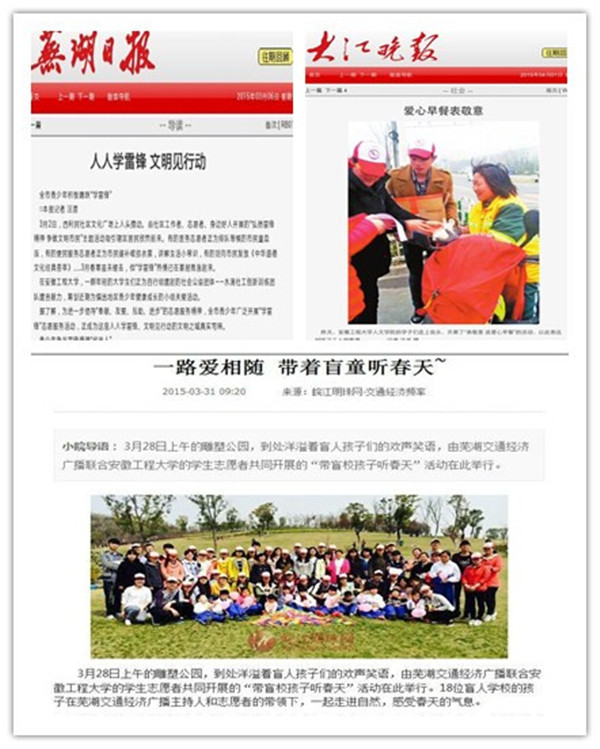 3月28日,“小雏菊”志愿服务团队带领盲校的孩子们在雕塑公园开展“带盲校孩子听春天”的志愿服务活动,志愿者们带孩子们摸雕塑、讲故事、聊心事、做游戏,志愿者们带着孩子们用耳朵聆听这个春天。3月31日,《皖江明珠网》以《一路爱相随 带着盲童听春天》为题对此项志愿活动进行了专题报道。