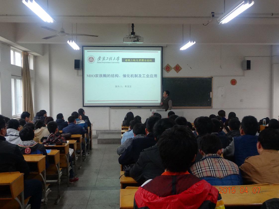 朱龙宝博士报告的题目为《MIO家族酶的结构、催化机制及工业应用》,介绍了MIO家族酶用于催化合成非天然芳香丙氨酸的优势、缺陷及工业应用属性,以生产企业提出MIO家族酶需要满足的性能为出发点,在深入分析MIO家族酶的结构和催化机制的基础上,采用分子生物学手段改造MIO家族酶使其满足工业生产的要求,详细介绍了怎样利用Webofscience查找文献、分析文献,进而寻找研究的创新点,研判课题研究的发展方向和趋势。朱龙宝博士还结合自己在江南大学进修学习的体会,深入浅出的讲解怎样获得研究思路、设计研究方案以及获取知识的方法,怎样解决在研究中工作中遇到的困难和挫折,同时勉励同学对自己的所学专业要充满信心,统筹安排好学习和生活。