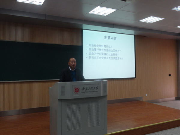 4月15日下午,应人文学院邀请,安徽师范大学经济管理学院伍旭中教授来我校为广大师生做了一场题为“新常态下企业社会责任问题思考”的精彩报告。人文学院教师和学生代表聆听了此次报告会,报告会由副院长刘军主持。