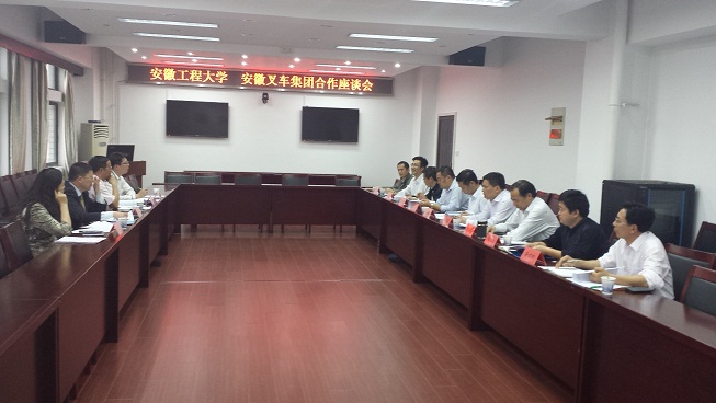 2015年5月4日,安徽叉车集团有限责任公司党委委员、安徽合力股份有限公司总工程师马庆丰,安徽合力股份有限公司人力资源部副部长吴运松、办公室副主任王宝芹、人力资源部主管孙剑等一行四人来校座谈交流。副校长李震出席,办公室、教务处、科技处、学生处、研究生部、团委、继续教育学院、机械与汽车工程学院负责人参加了座谈会。办公室主任王弘主持会议。