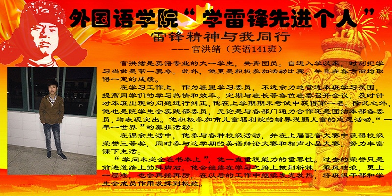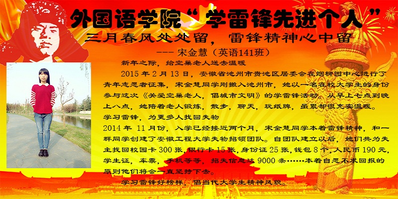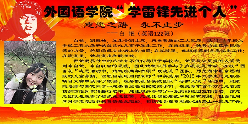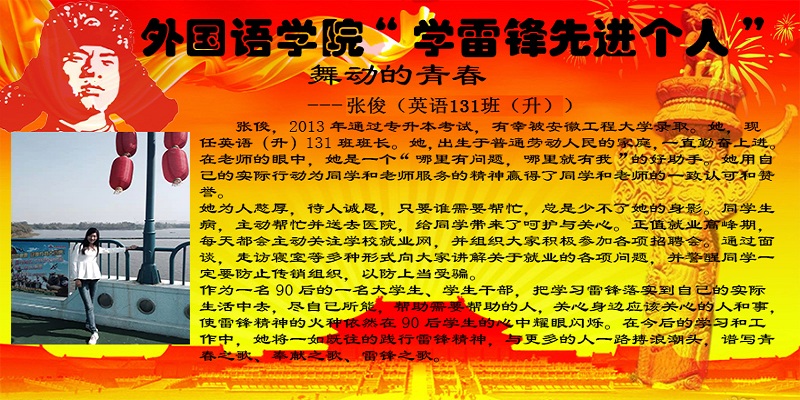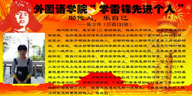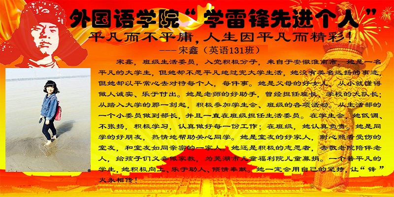 3月份学院开展“团百花”学雷锋志愿服务活动以来,各班级、各团支部积极组织开展学雷锋活动,在我们身边涌现出许多活雷锋,体现了新时代的精神风貌。为更好地让雷锋精神在我们身边发扬光大,经同学们的推选,挖掘了一批“学雷锋先进个人”,现将他们的事迹进行展示。希望广大同学学习他们身上的闪光点,弘扬“五四”精神,不断加强自身的思想道德修养,用实际行动展现当代大学生的青春风采。
