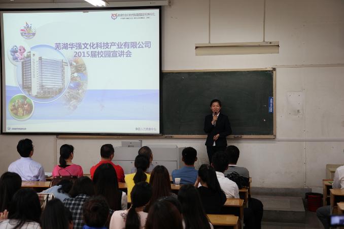 宣讲会首先请华强集团芜湖方特人事部的杨飞专员详细介绍方特理念、发展方向以及员工职业发展规划,并将6月份即将组建的“方特班”的具体课程安排、选拔方法、就业支持等方面进行宣讲;接着南京巾铭文化传媒有限公司“青春防线”项目组导演金椿年教授介绍了即将在我院创建的表演艺术工作室项目相关情况。宣讲会后,学院邀请就职于安徽海螺集团和安徽三安光电的体育表演专业2014届毕业生陆扬和张松分别介绍自己一年来的职业发展,并对学弟学妹在大学如何提升自己的就业能力提出建议。