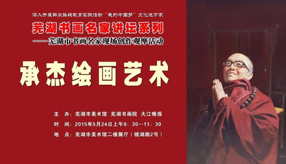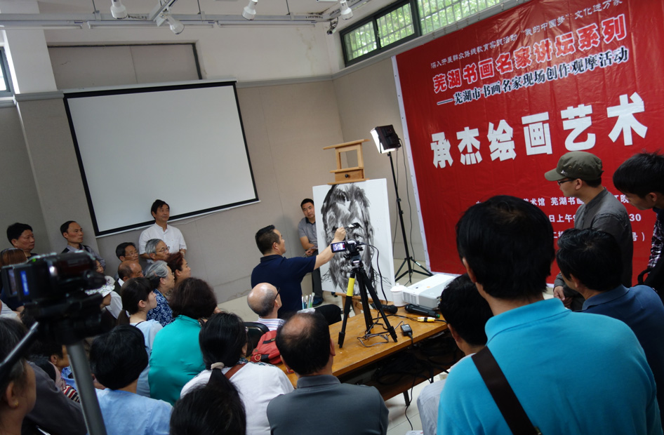 5月24日上午,应芜湖书画院邀请,艺术学院副院长承杰教授走进芜湖《书画名家讲坛》,在市美术馆二楼展厅进行绘画艺术讲座,并进行现场创作。活动由芜湖书画院院长、著名画家王广先生主持,我校教师项宁也受邀参加现场创作交流。