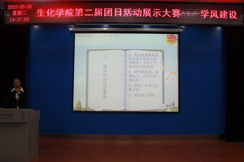 5月26日晚7点在五教117,生化学院第二届主题团日活动展示大赛拉开帷幕,本次团日活动的主题是“学风建设”展示,全院一、二、三年级共53个团支部均参与了本次比赛。生化学院党委副书记章兵,学院团委副书记胡云,辅导员张宁、高俊杰,部分学生团干代表担任本次比赛评委。