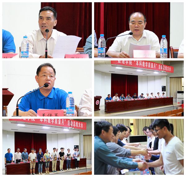 会上,数理学院院长费为银从领导重视、加强宣传、营造氛围;“本科教学质量月”活动回顾;存在的不足和今后努力的方向等三个方面对数理学院为期两个月的“本科教学质量月”活动进行了全面的总结。他说,数理学院“本科教学质量月”活动虽然即将告一段落,但学院抓本科教学质量的决心没有变、制度没有变,执行没有变,教学质量始终是培养人才的关键,始终是兴院之本。学院将认真贯彻落实学校教学工作会议精神,深入开展教育思想观念大讨论,进一步注重教学意识强化,坚持特色发展,围绕学校人才培养目标,优化人才培养方案,深化教学改革,创新教育教学方法,不断提高人才培养质量。数理学院副院长、数学建模总教练王传玉对十一届芜湖高校数学建模联赛的基本情况作了总结,宣读了获奖结果,主席台领导为获得一等奖的学生代表颁发获奖荣誉证书。